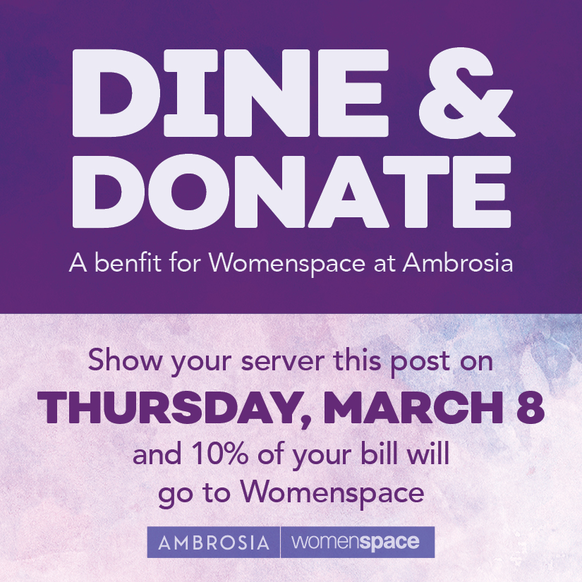 In recognition of International Women's Day, Ambrosia is proud to partner with Womenspace for a Dine & Donate benefit. To get involved, join us for dinner on Thursday, March 8 and show your server this page and 10% of your bill will go to Womenspace. Womenspace is a local nonprofit that serves victims and survivors of domestic violence in intimate partner relationships.